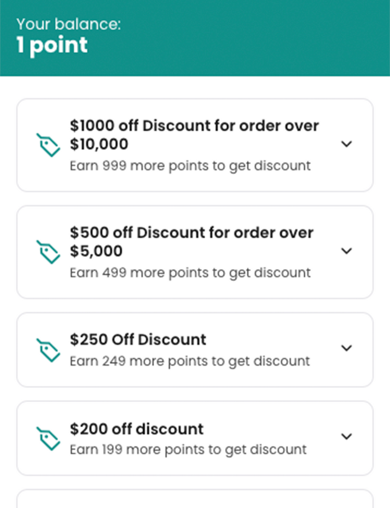 Your point redemption cannot exceed 50% of your order's subtotal. For example, to use $100 worth of points, your subtotal must be at least $200. Similarly, to use a $500 or $1,000 discount, your subtotal must exceed $5,000 or $10,000 respectively.